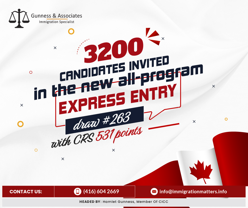 Want to know more details about “3200 Candidates invited in the new all-program Express Entry draw 263” you can contact one of our immigration specialists at Gunness & Associates.